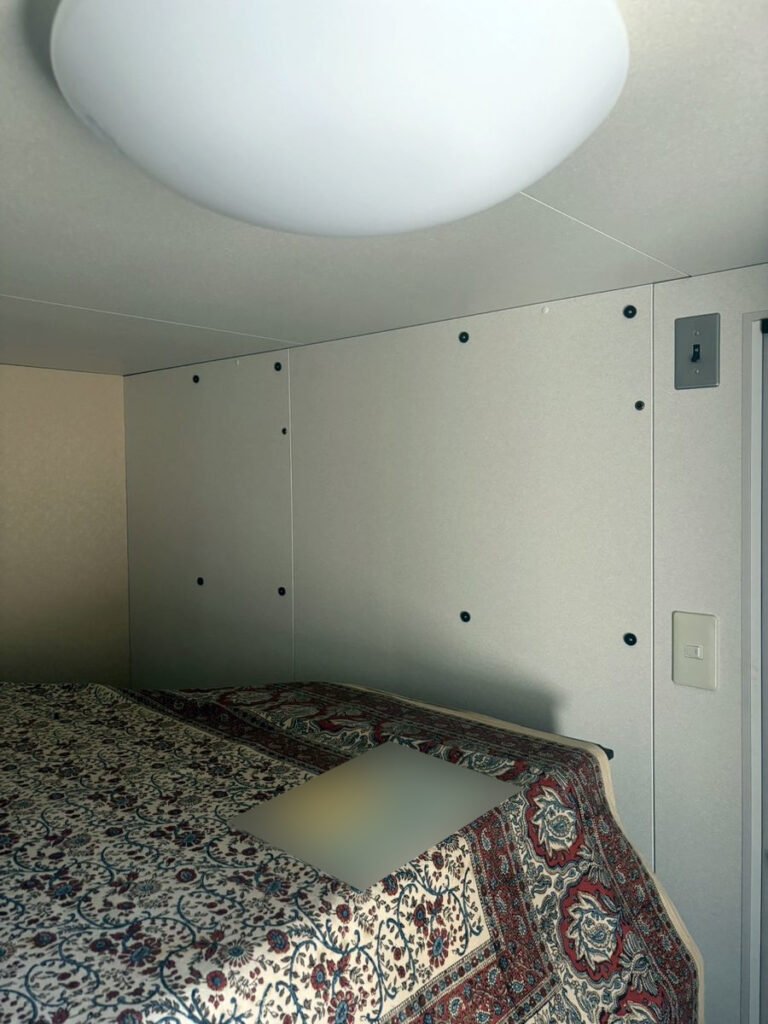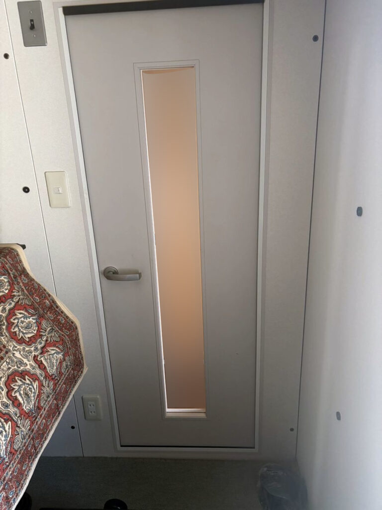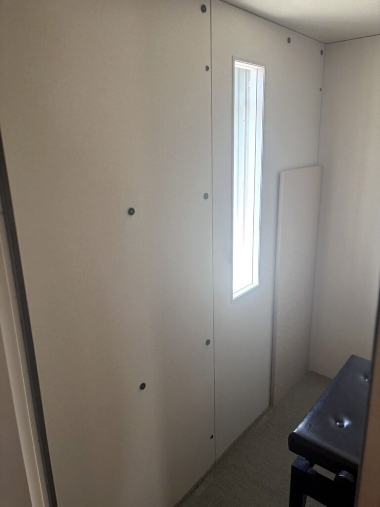 | その他 仕様 | ・ドア:木製防音ドア(外開き/左吊元) ・フィックス窓:1枚 ・壁音場パネル:9枚 ・照明器具:無し(別途税込33,000円にて新品手配可) ・他電装:換気扇(中古)、コンセント、スイッチ ・床仕上:防炎カーペット無し(別途税込24,640円にて新品手配可) ・床仕様:浮床構造(壁・天井を除く)/底床パネル仕様(畳・カーペット上に設置可) ・エアコン取付:エアコン取付痕なし(新規取付については応談) FAQ:エアコン取付について |