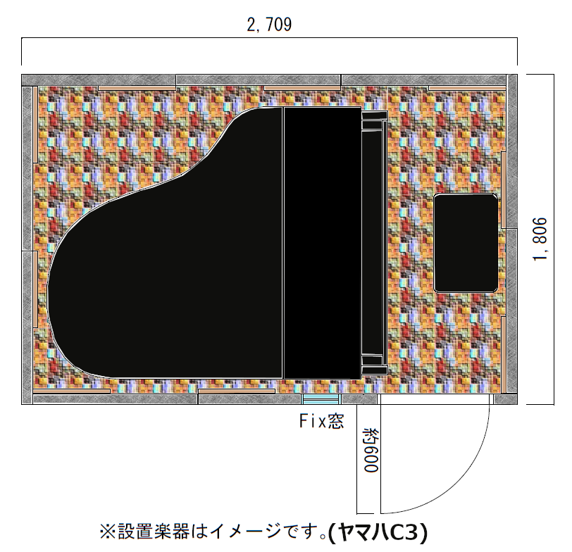- 遮音性能「Dr値」「D値」は製品発売時のJIS規格に基づく測定・評価方法により、メーカー実験室での実測値に基いた性能表示です。使用楽器・建物構造・設置環境等の条件により本来の性能が発揮できない場合があり、遮音性能を保証するものではありません。