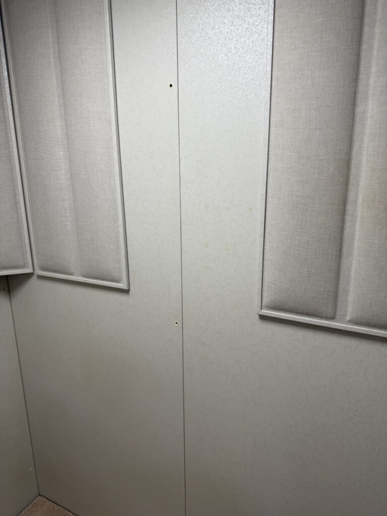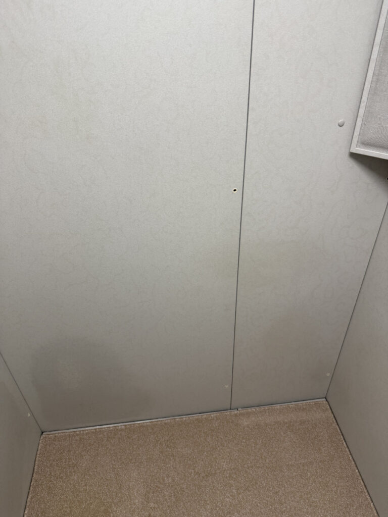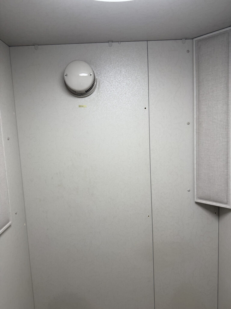 | その他 仕様 | ・ドア:木製防音ドア(外開き/右吊元) ・フィックス窓:無し ・壁音場パネル:7枚 ・照明器具:あり(中古品) ・他電装:換気扇(中古)、コンセント、スイッチ ・床仕上:防炎カーペット(中古品/別途税込14,960円にて新品交換可) ・床仕様:浮床構造(畳及びカーペット上に設置する場合は別売底床パネルが必要) ・エアコン取付:エアコン取付痕あり(新規取付については応談) FAQ:エアコン取付について |