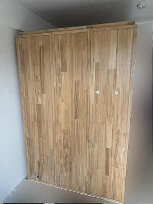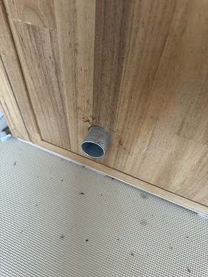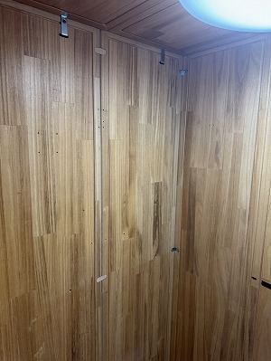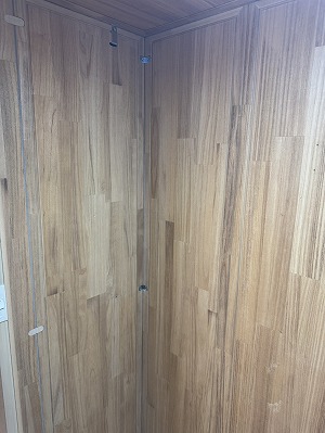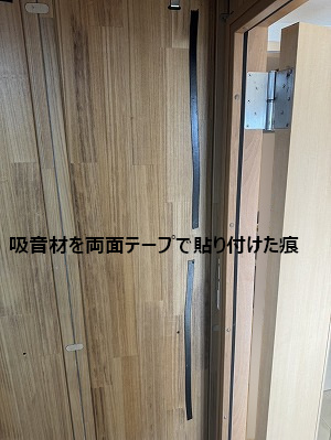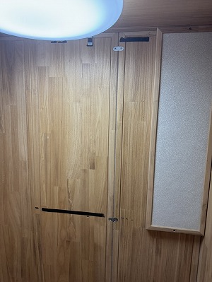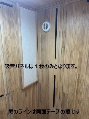 写真では吸音パネルが1枚だけですが、すべて揃っています。前オーナー様が収録ブースとして使用していたため、独自に吸音パネルを貼っていた跡(両面テープ跡)が残っています。表面材が柔らかい桐のため、多少の小キズや使用感はありますが、性能上の問題はありません。
