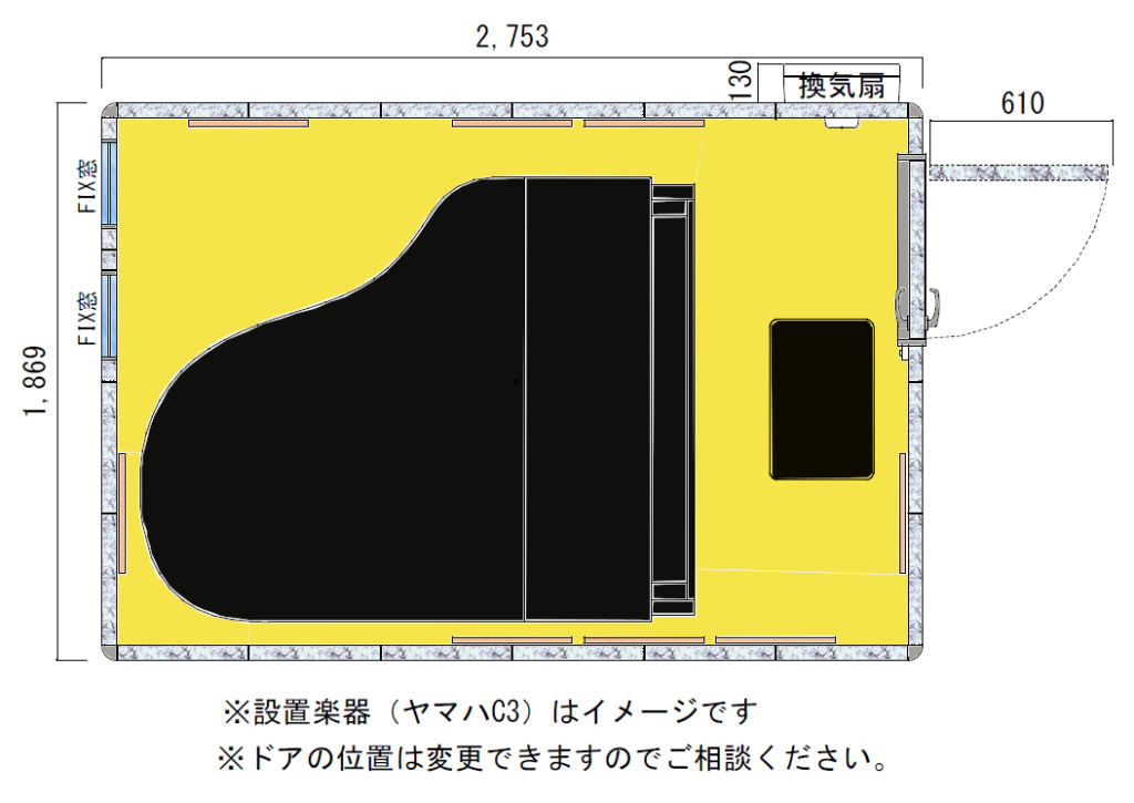- 設置場所に応じてドア・換気扇・FIX窓・音場パネル類の位置変更が可能ですが、モデルによって制限があります。