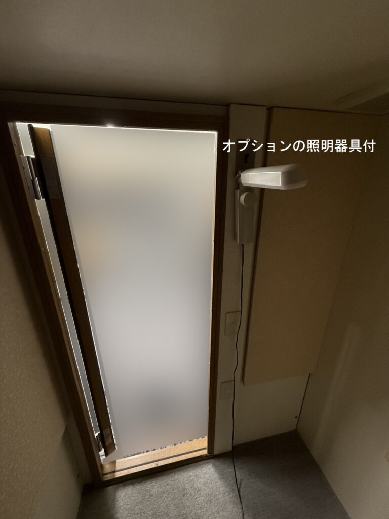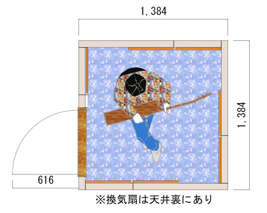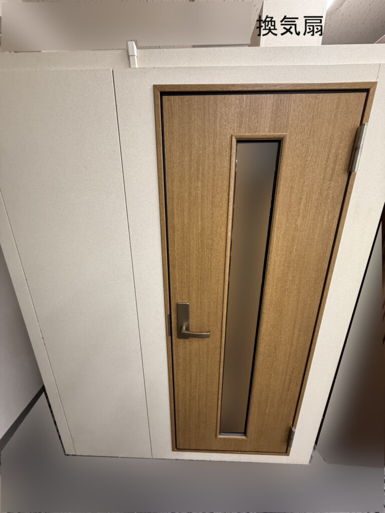 | その他 仕様 | ・ドア:木製防音ドア(外開き/右吊元) ・フィックス窓:無し ・壁音場パネル:7枚 ・照明器具:ツイン蛍光灯(中古品) ・他電装:換気扇(中古)、コンセント、スイッチ ・床仕上:防炎カーペット(中古品/別途税込11,660円にて新品交換可) ・床仕様:浮床構造(壁・天井を除く)/底床パネル標準仕様(畳・カーペット上に設置可) ・エアコン取付:エアコン取付痕なし(新規取付については応談) FAQ:エアコン取付について |