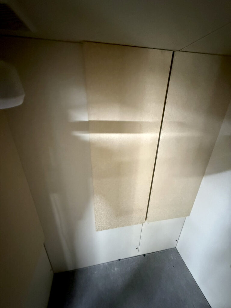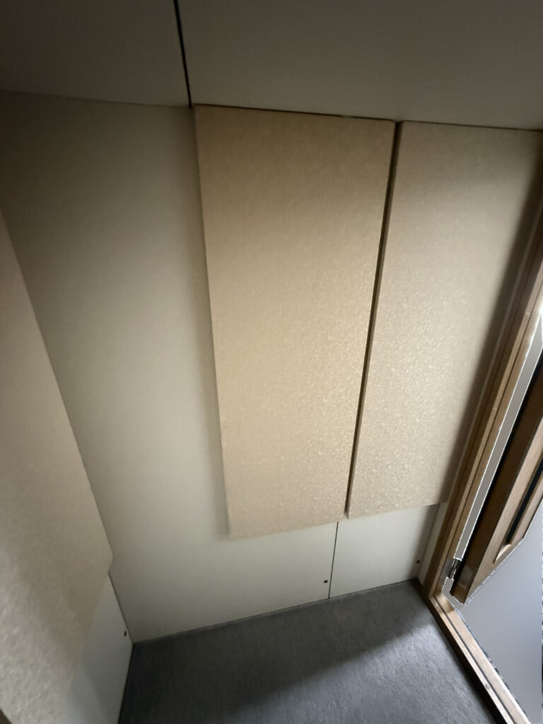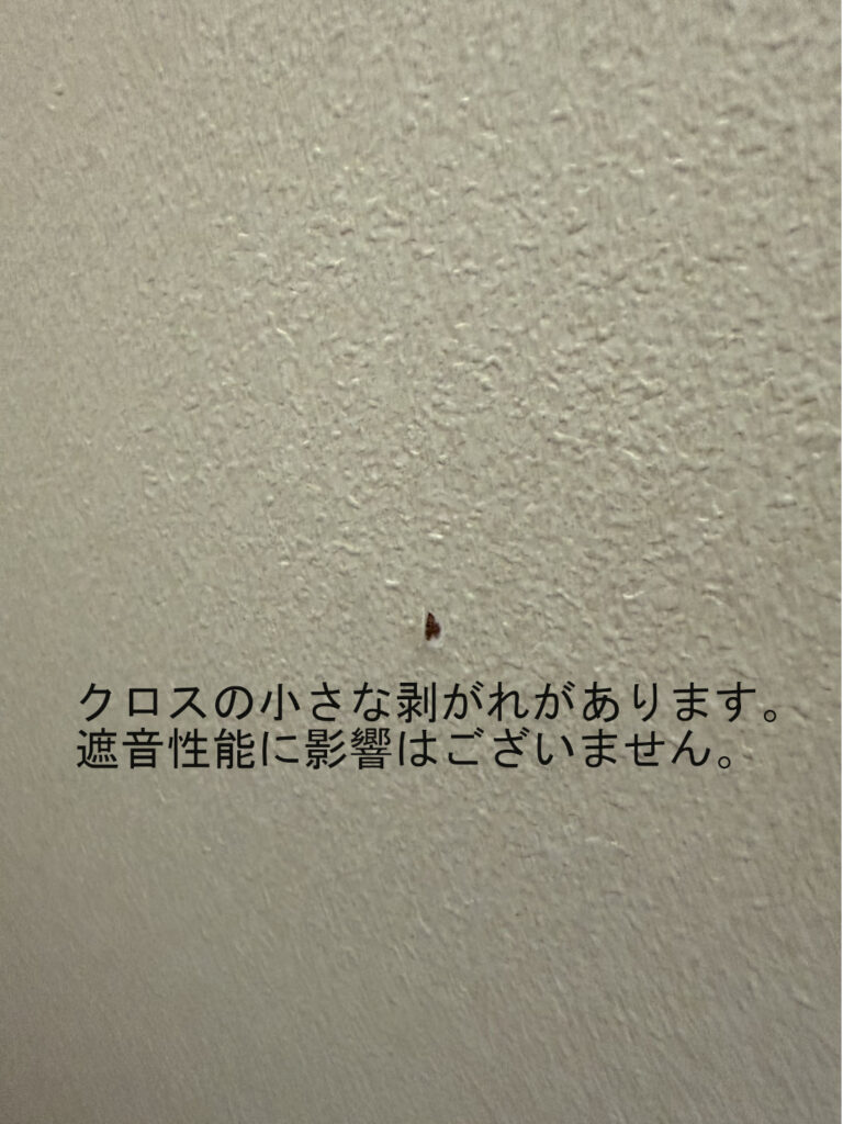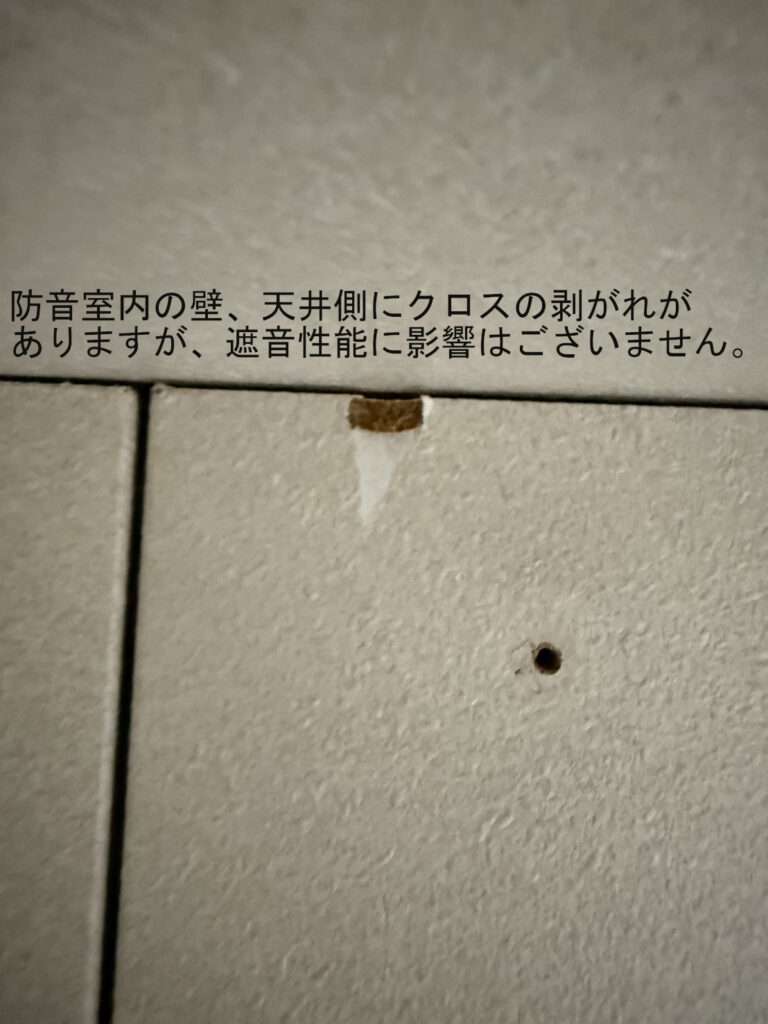 年数相応に、クロスの劣化や変色、多少のキズは見られますが、防音室としての状態はよく遮音にも問題はございません。照明は壁かけタイプのものとなっております。外観よりも実用性・コストパフォーマンスを重視したいかたにとっては、非常に魅力的な一台。換気扇は天井裏にとり付けられていますが、将来的に故障した場合は新品の壁掛けタイプも取付可能(有償)です。多少の使用感はありますが、その分価格と性能のバランスは◎。