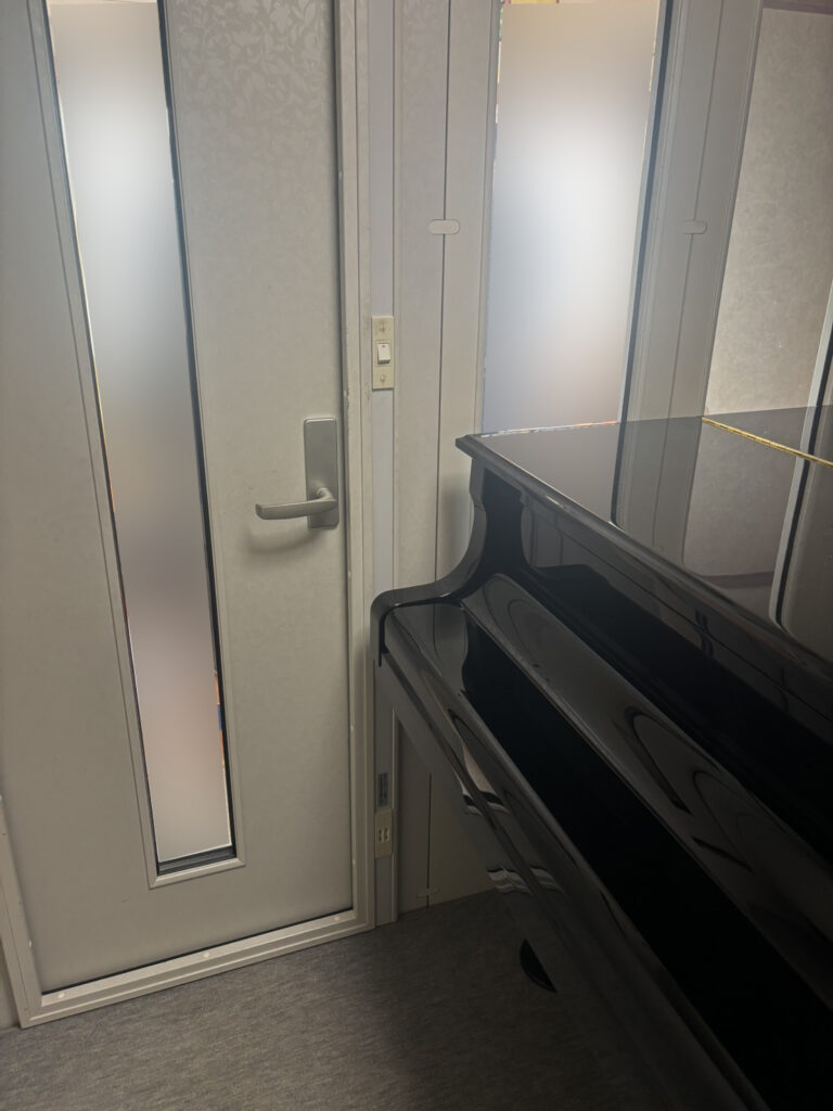 防音室は、C3サイズまでのグランドピアノが設置可能な約3.0畳の広さ。FIX窓を2枚備え、室内高は約2100mmを確保しており、採光とゆとりのある空間で快適に演奏をお楽しみいただけます。