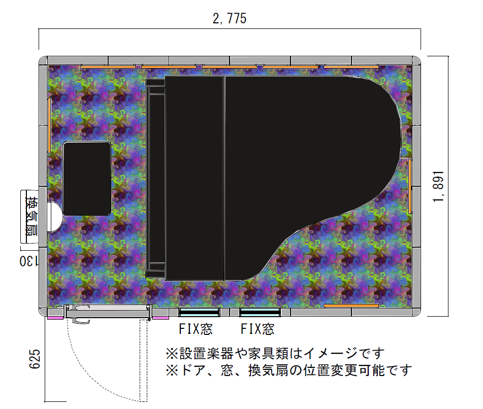 - 設置場所に応じてドア・換気扇・FIX窓・音場パネル類の位置変更が可能ですが、モデルによって制限があります。