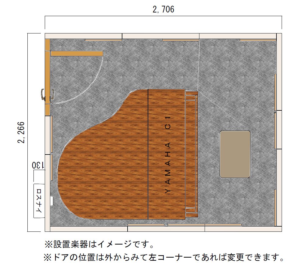 C3クラスのグランドピアノが入るサイズです。