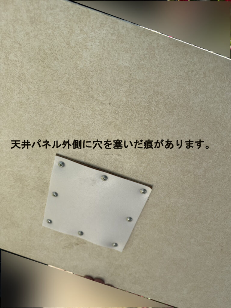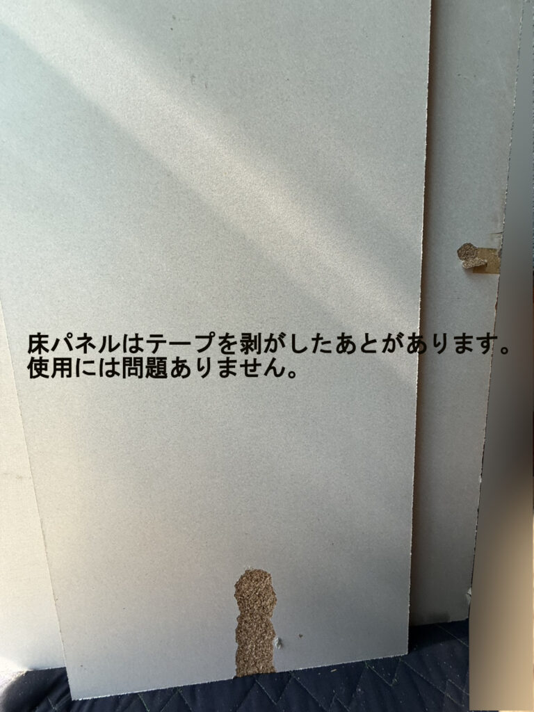 経年変化による色の変色、使用によるクロスや塗装の剥げがあります。天井パネルは穴を塞いだ痕、床パネルは両面テープを剥がした痕などありますが、性能には問題ございません。汚れは出荷前のクリーニングである程度除去いたします。